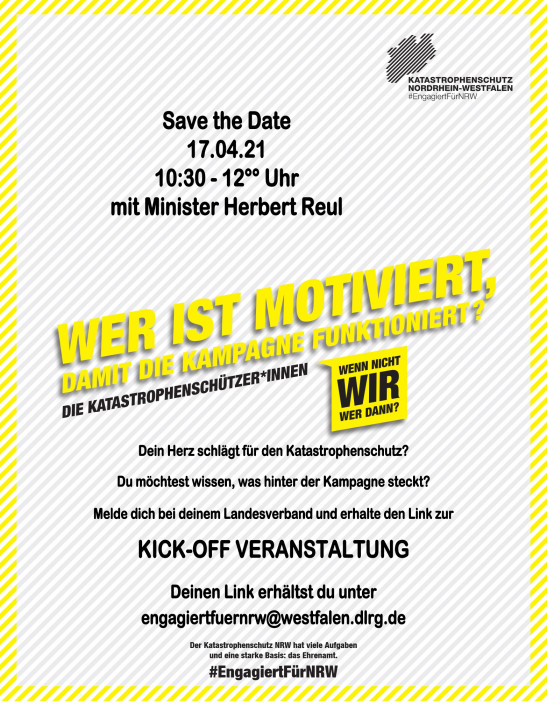 Am 17.04.2021 findet eine virtuelle Kick-Off Veranstaltung zur Imagestrategie im Katastrophenschutzstatt. Alle Interessierten können hierfür beim Landesverband anmelden. ... Mehr erfahren