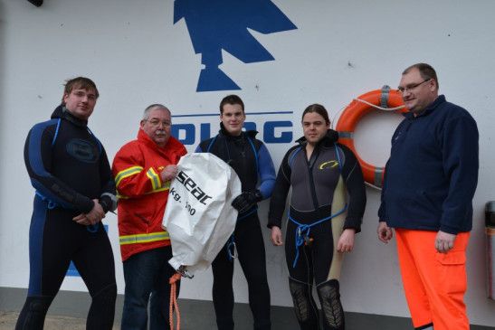 Am 15.04.2014 überreichte der Leiter der DLRG-Ortsgruppe Dortmund-Hörde e. V., Heinz-Jürgen Meyer, den Einsatztauchern des DLRG-Bezirks Dortmund e. V. zwei Hebesäcke für die Tauchausbildung. Mit der neuen Ausrüstung kann die Dortmunder Gruppe der Einsatztaucher, deren Größe sich in den letzten 3 Jahren fast verdoppelt hat, auch mit diesem eigenem Material direkt bei den verschiedenen Tauchgängen üben und im Einsatzfall schnell darauf zurückgreifen. Ein Hebesack dient zum Anheben von Gegenständen unter Wasser und dem Transport bis an die Oberfläche. Dabei wird dieser mit normaler Atemluft aufgefüllt und steigt aufgrund der geringeren Dichte von Luft an die Wasseroberfläche, sobald die Auftriebskraft das anhä ... Mehr erfahren